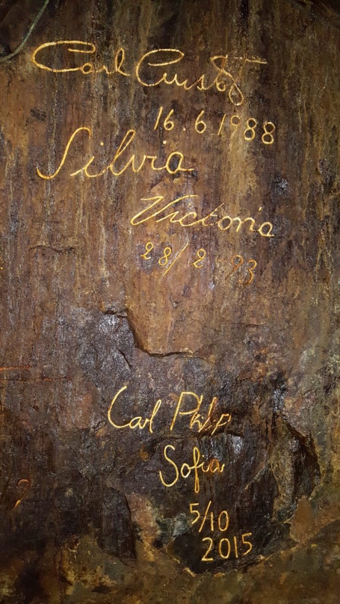 Es ging 67 Meter unter die Erde. Und es war eiskalt. Denn egal welche Temperatur über Tage herrscht. Hier unten sind es immer um die 5 Grad. Überall tropft Wasser. Wir mussten uns also sehr warm anziehen. Als der Guide einmal seine Grubenlampe ausgemacht hat, war es im wahrsten Sinne des Wortes stockduster. Man hat einfach nichts mehr gesehen. Wahnsinn! Vor uns war übrigens auch schon prominenter Besuch an selber Stelle. Es hat Tradition, dass die Mitglieder des Königshauses die Mine in Falun besuchen – und sich dort mit goldener Unterschrift verewigen!