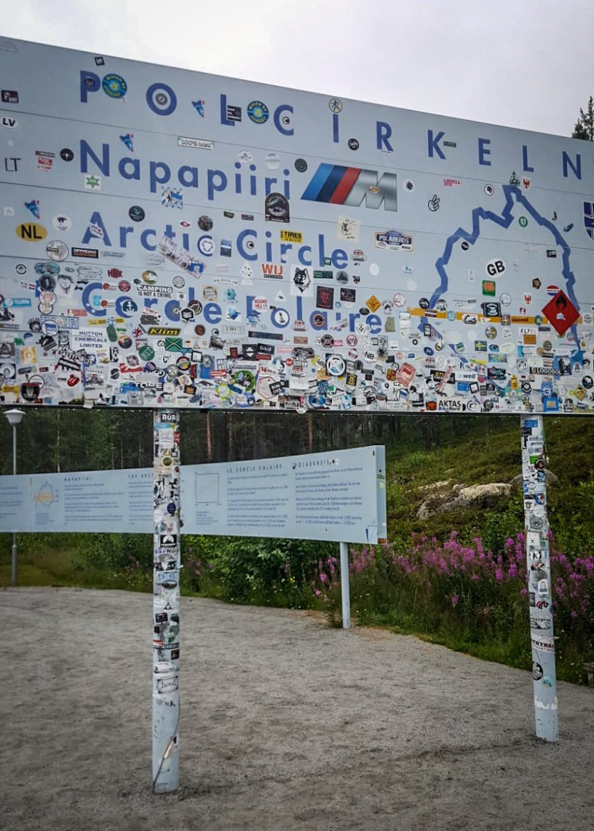 Dieses spezielle Gefühl erlebte ich dann auch, als wir den Polarkreis überquerten. Das habe ich nämlich schon unzählige Male gemacht. Aber diesmal das erste Mal mit meiner Familie. Ich war richtig aufgeregt! Ich habe Tim und Neo die Huskyfarm von Stina und Matti gezeigt und von dort sind wir weiter nach Jokkmokk gefahren. Das kenne ich eigentlich nur zugeschneit und zugefroren. Also war es für mich völlig ungewohnt, Jokkmokk im schönsten Sonnenschein zu erleben. Verrückt.