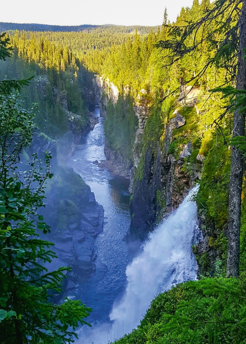 Und dann gab es noch eine richtig schöne und spektakuläre Wanderung am selben Abend. Das lag auch an unserem Etappenziel, dem Hällingsåfallet, der auch als Schwedens "Grand Canyon" bezeichnet wird. Wir sind hier zunächst wunderschön am Fluss entlang gewandert. Dann tauchte der Canyon plötzlich auf. Das war ein supertolles Erlebnis. Es hat laut gebraust und das Panorama war wirklich spektakulär!