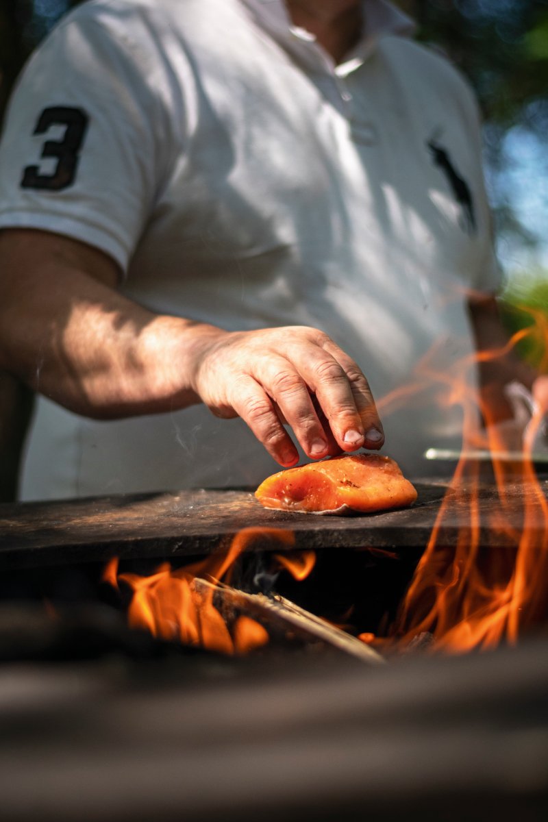 Bei uns bieten wir eigenes Bio-Naturweidefleisch an, das auf einem Ofengrill zubereitet wird. Dazu werden lokale Kartoffeln gekocht und mit hiesigem Senf und eigenem Gemüse gemischt. Das wird übrigens vorher eigenhändig von den Gästen gepflückt. Dazu gibt es selbst hergestelltes Knäckebrot und BBQ-Sauce. Nach dem Essen dürfen ein Kaffee und hausgemachte Zimtschnecken dann natürlich nicht fehlen.