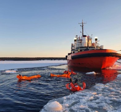 Nach knapp 45 Minuten Fahrt durch das Eis findet Kapitän Thomas Wiren ein Plätzchen im Meer und bringt die Arctic Explorer zum Stehen. Die Gäste verkleiden sich dann mit den quietschorangen Überlebensanzügen und gehen erst aufs Eis, bevor der mutige Sprung ins Wasser folgt. Dies erinnert meist an eine Notfallübung für die Schiffsbesatzung. Das Schönes ist: Dieses einzigartige Erlebnis, ein Schwimmstopp im Bottnischen Meer, kann jede und jeder tun. Es sind keine besonderen körperlichen Fähigkeiten erforderlich.