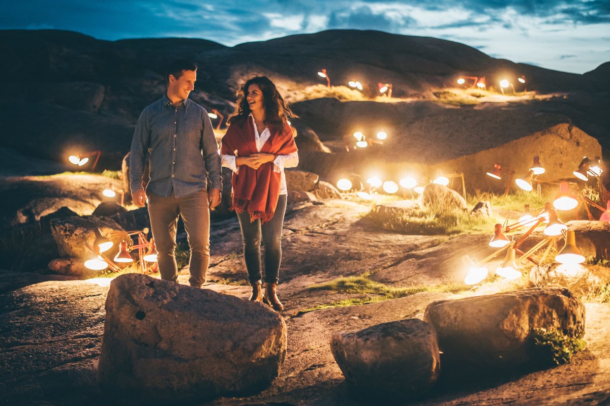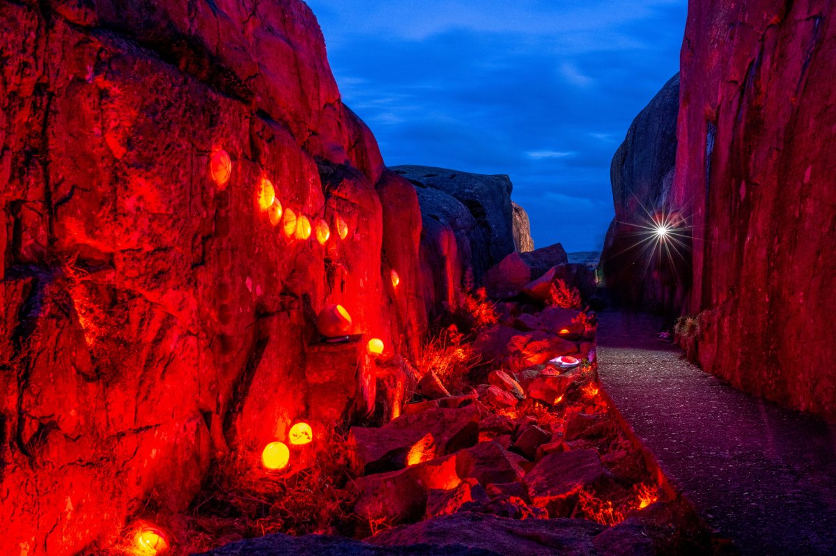 Die Insel Smögen mit ihrer kargen Natur und den rosafarbenen Granitfelsen, ihren offenen Horizonten und Felsformationen, die eine Abfolge einzigartiger "natürlicher Räume" bilden, stellt eine Location dar, die man als "Outdoor Art Light Gallery in Nature" bezeichnet. Es liegt mitten im Nirgendwo, weit weg von den großen Städten und ohne Lichtverschmutzung, was Smögen ideal für die Präsentation von Lichtkunst macht.