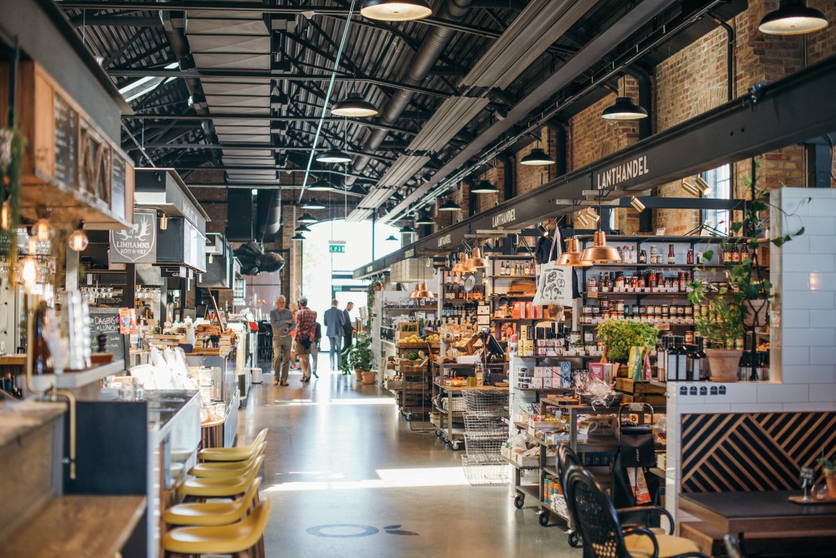Eine moderne Lebensmittelhalle mit vielen Ständen, die sowohl Produkte als auch Lebensmittel anbieten. Qualität ist ein Hauptfaktor für das Konzept und die Umgebung ist sehr charmant mit alten industriellen Designelementen in einem alten Backsteingebäude.